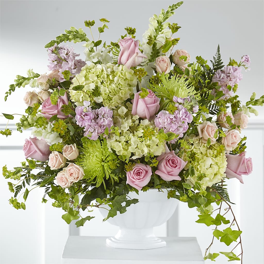 Elegantly crafted with an array of pink and green blooms, this bouquet shares your messages of sympathy with grace. Our Radiant Embrace is handcrafted with hydrangea, spider mums, roses and snapdragons to celebrate the life of a dear loved one. The arrangement is presented in a plastic compote vase that replicates the look of fine porcelain.